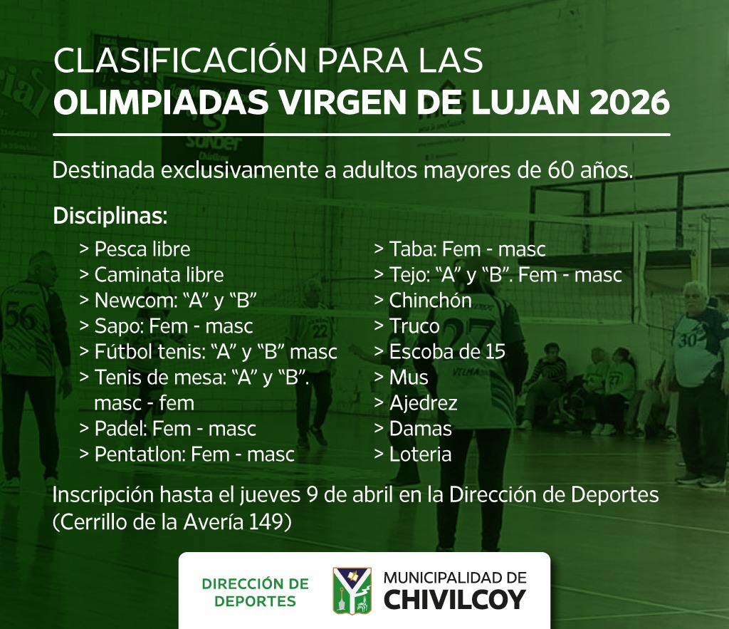 La Dirección de Deportes de Chivilcoy anunció su participación en la Olimpíada de la Virgen de Luján, que se desarrollará el próximo 13 de mayo en el Club Timón de la localidad de Jáuregui. La iniciativa está destinada a adultos mayores y contará con una etapa local previa que permitirá definir a los representantes de la ciudad.