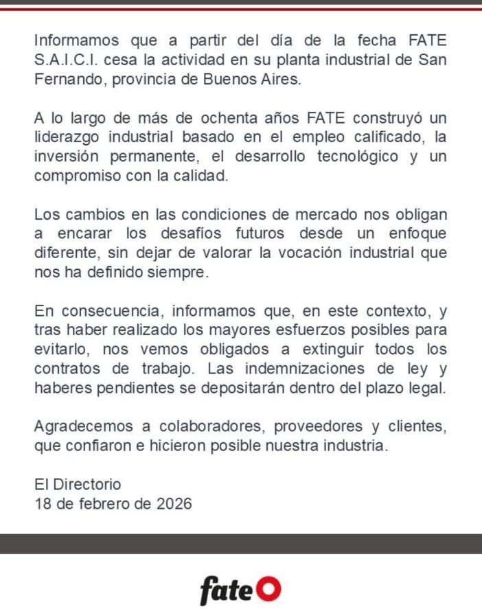 La empresa, propiedad de la familia Madanes Quintanilla dueña también de la siderúrgica Aluar, exenta de esta crisis y que continuará su negocio, confirmó que cesará su actividad en su planta de Virreyes, en San Fernando, provincia de Buenos Aires,