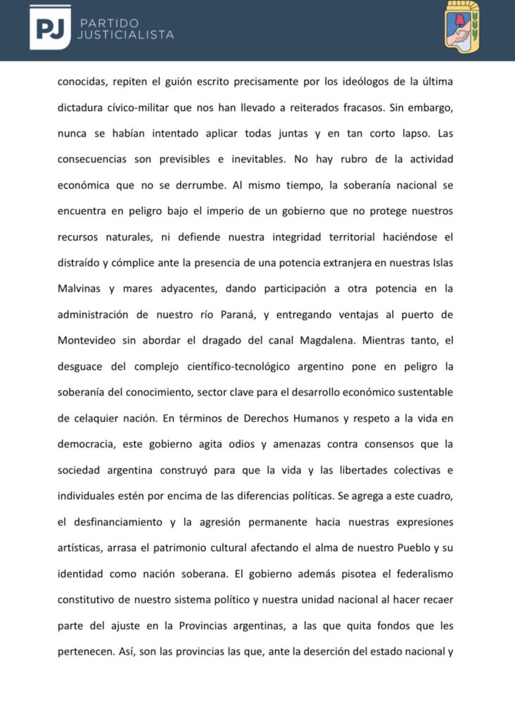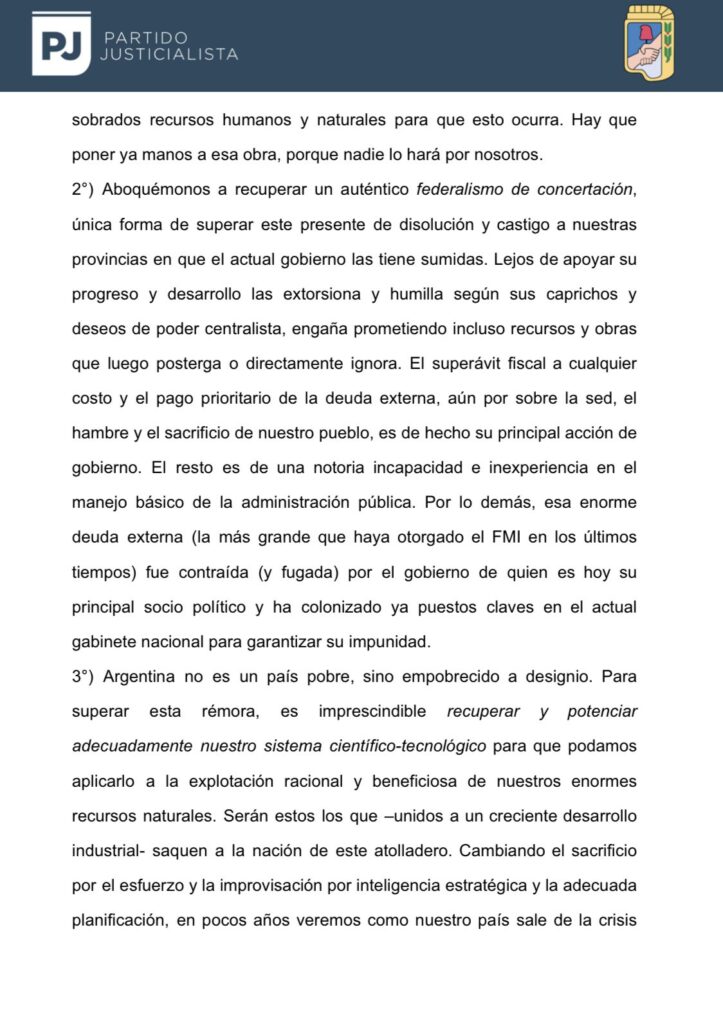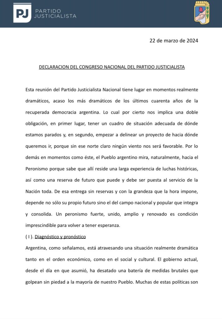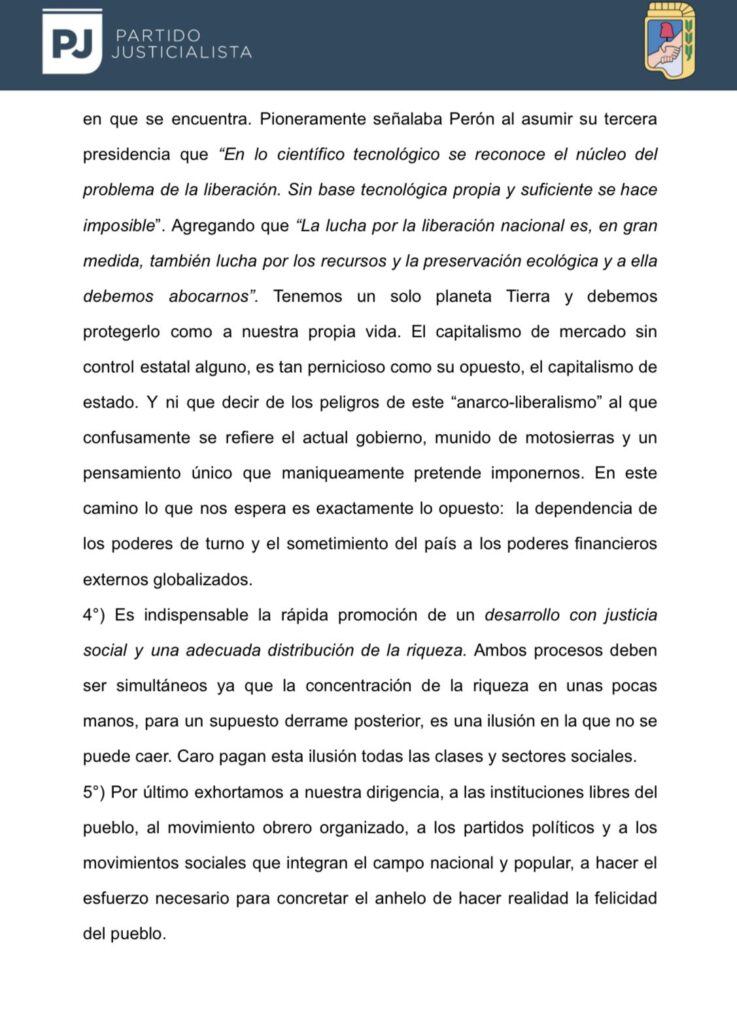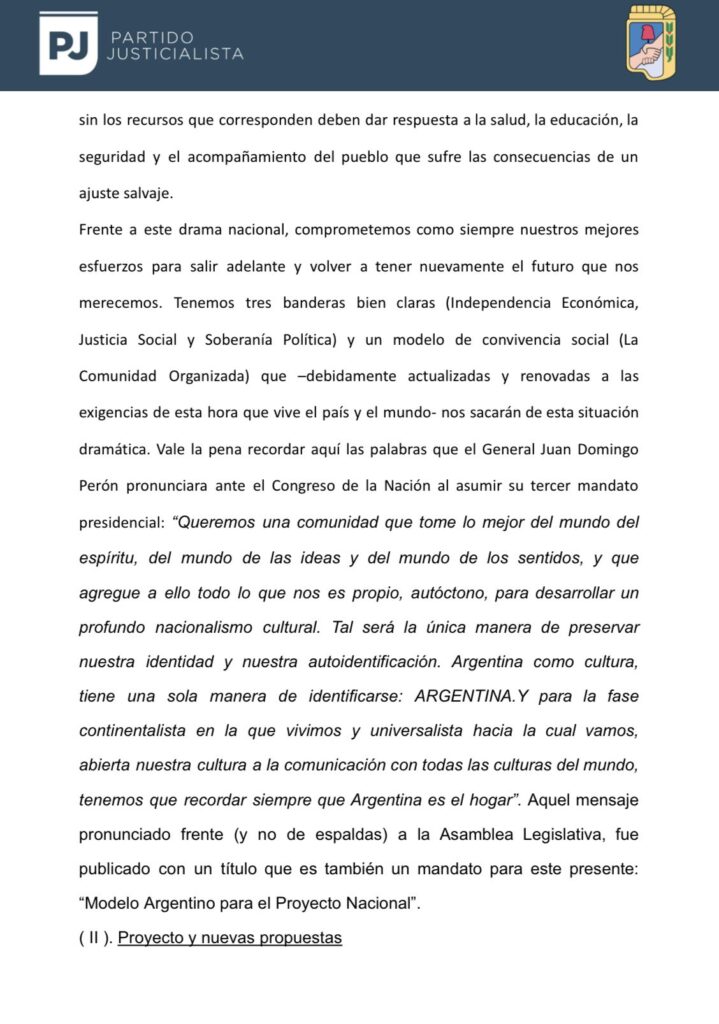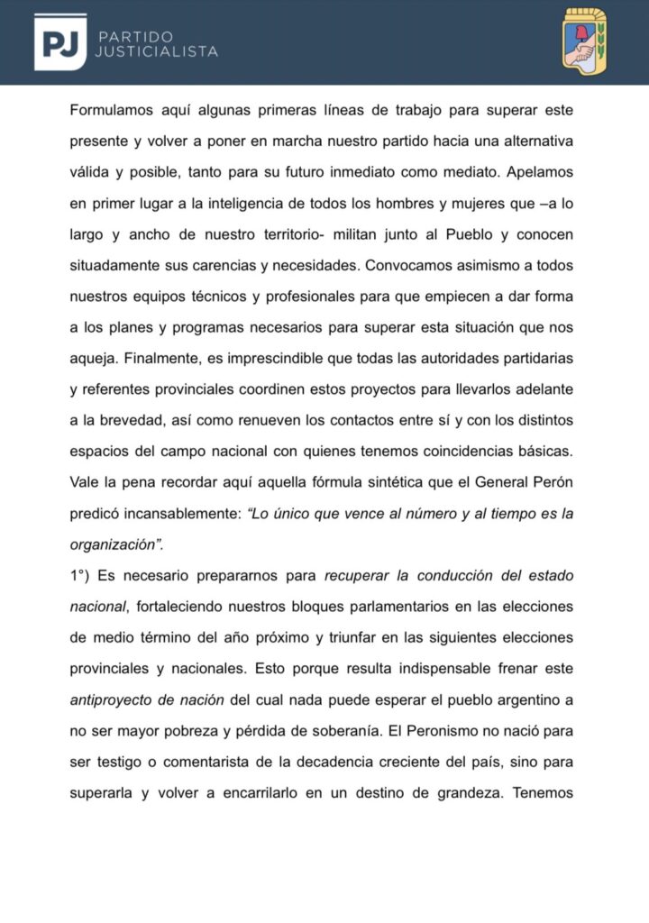 El partido reconoció «una doble obligación»: «tener un cuadro de situación adecuada de dónde estamos parados» y «o, empezar a delinear un proyecto de hacia dónde queremos ir, porque sin ese norte claro ningún viento nos será favorable». «El pueblo argentino mira, naturalmente, hacia el peronismo porque sabe que allí reside una larga experiencia de luchas históricas, así como una reserva de futuro que puede y debe ser puesta al servicio de la Nación», consideraron en el documento final.