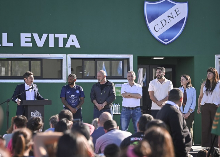 El gobernador de la provincia de Buenos Aires, Axel Kicillof, encabezó este martes la inauguración del complejo deportivo del Club Nacional Evita en el municipio de Ensenada. Fue junto al ministro de Desarrollo de la Comunidad, Andrés Larroque; el intendente local, Mario Secco; el dirigente Hugo Moyano (h); y el presidente del club, Rodrigo Herrera.