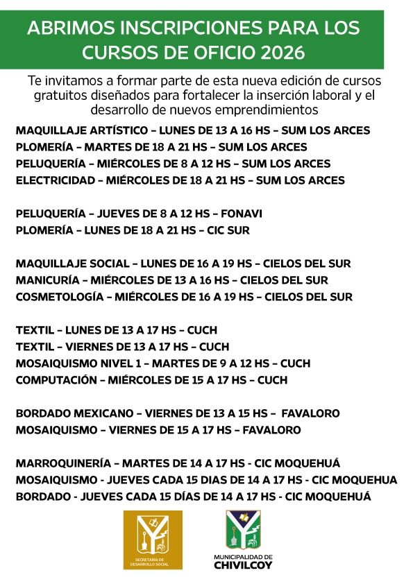 Aronna destacó que “estos cursos tienen un objetivo muy claro que es generar oportunidades reales de formación, capacitación y trabajo para nuestros vecinos de Chivilcoy”. En esta nueva etapa se dictarán talleres de Bordado Mexicano, Computación, Cosmetología, Electricidad, Manicuría, Maquillaje Social y Artístico, Marroquinería, Mosaiquismo, Peluquería, Plomería y Textil.