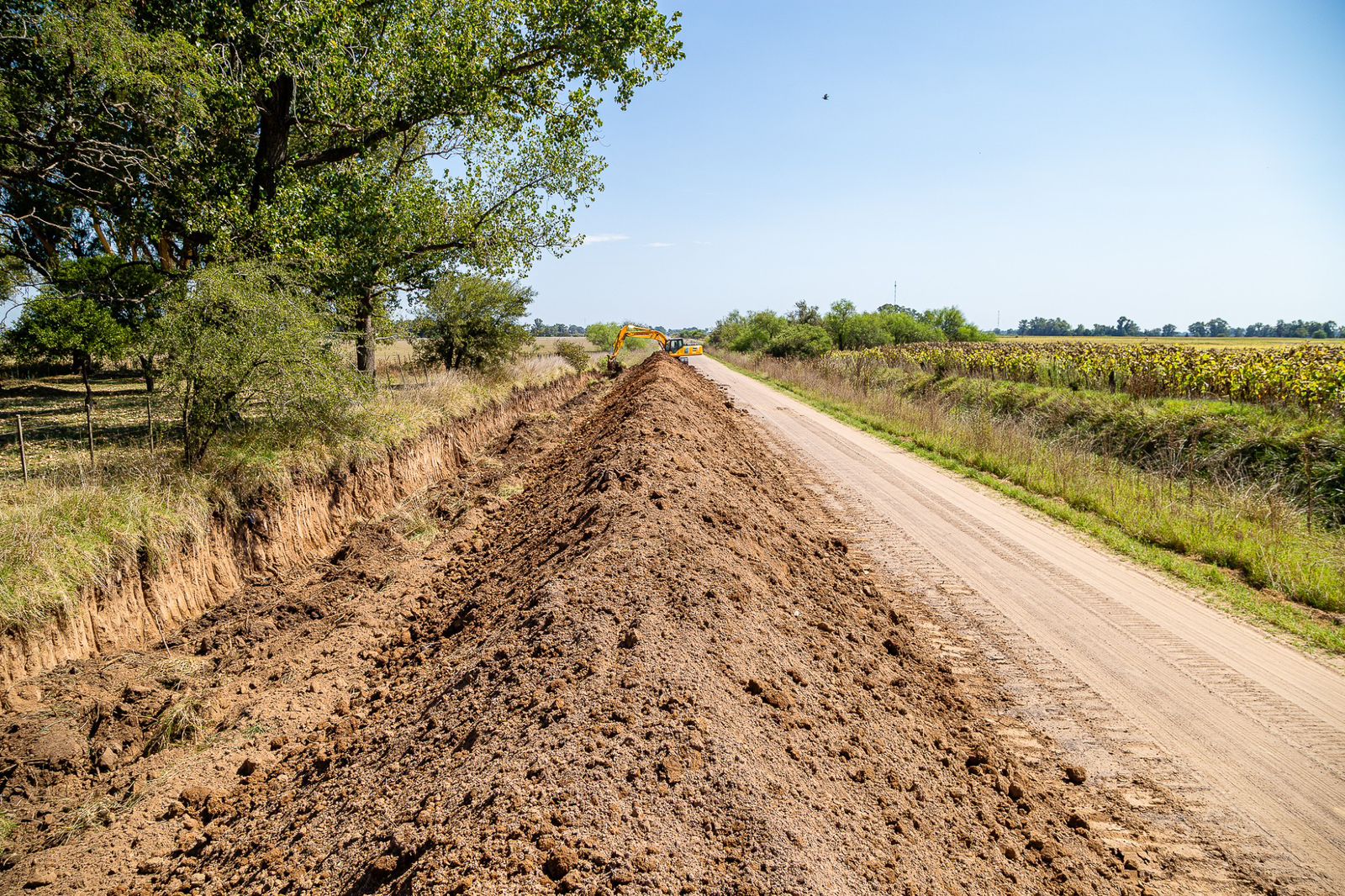 La intervención actual se concentra en los primeros 3 a 4 kilómetros, el tramo más comprometido, donde se realiza un alteo con extracción lateral mediante retroexcavadora, elevando la cota del camino entre 30 y 50 centímetros.